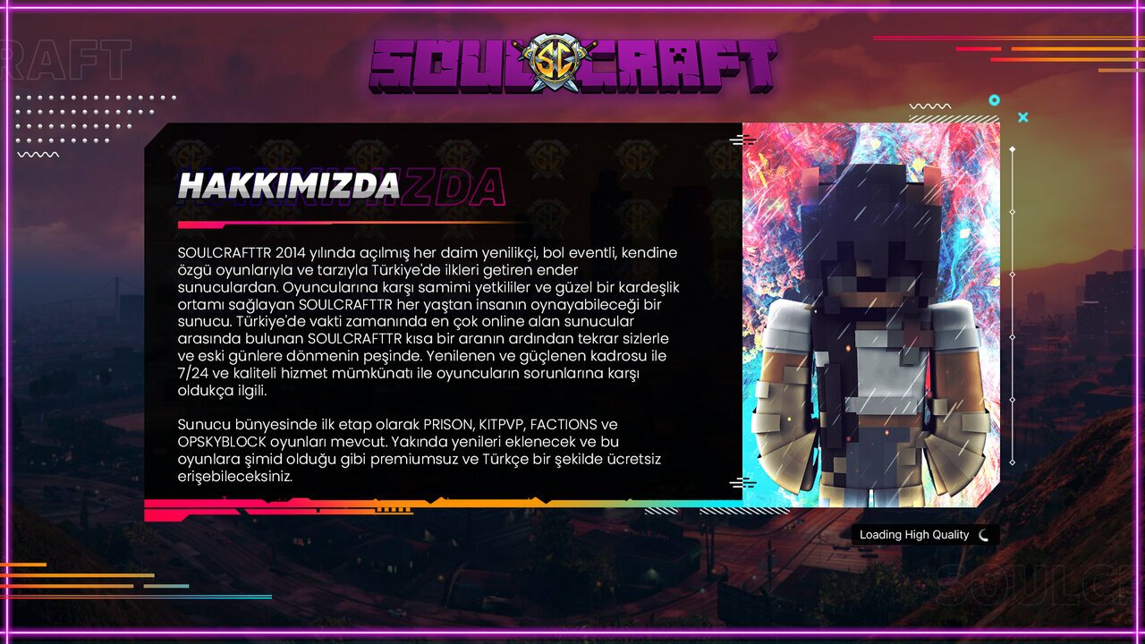 SOULCRAFTTR 2014 yılında açılmış her daim yenilikçi, bol eventli, kendine özgü oyunlarıyla ve tarzıyla Türkiye'de ilkleri getiren ender sunuculardan. Oyuncularına karşı samimi yetkililer ve güzel bir kardeşlik ortamı sağlayan SOULCRAFTTR her yaştan insanın oynayabileceği bir sunucu. Türkiye'de vakti zamanında en çok online alan sunucular arasında bulunan SOULCRAFTTR kısa bir aranın ardından tekrar sizlerle ve eski günlere dönmenin peşinde. Yenilenen ve güçlenen kadrosu ile 7/24 ve kaliteli hizmet mümkünatı ile oyuncuların sorunlarına karşı oldukça ilgili.